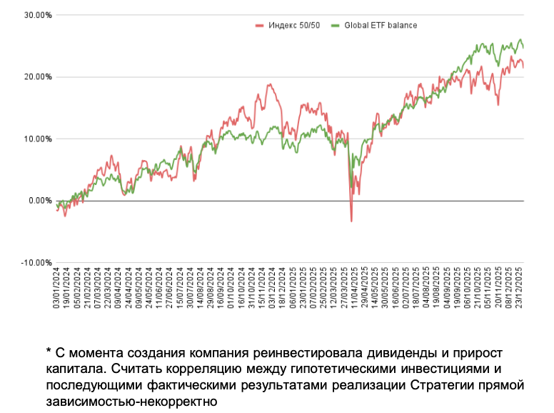 C 2024 г. сбалансированная стратегия принесла клиентам 36,46% прибыли (18,23% годовых), а индекс S&P 500 50/50 вырос на 21,36% (10,68% годовых).